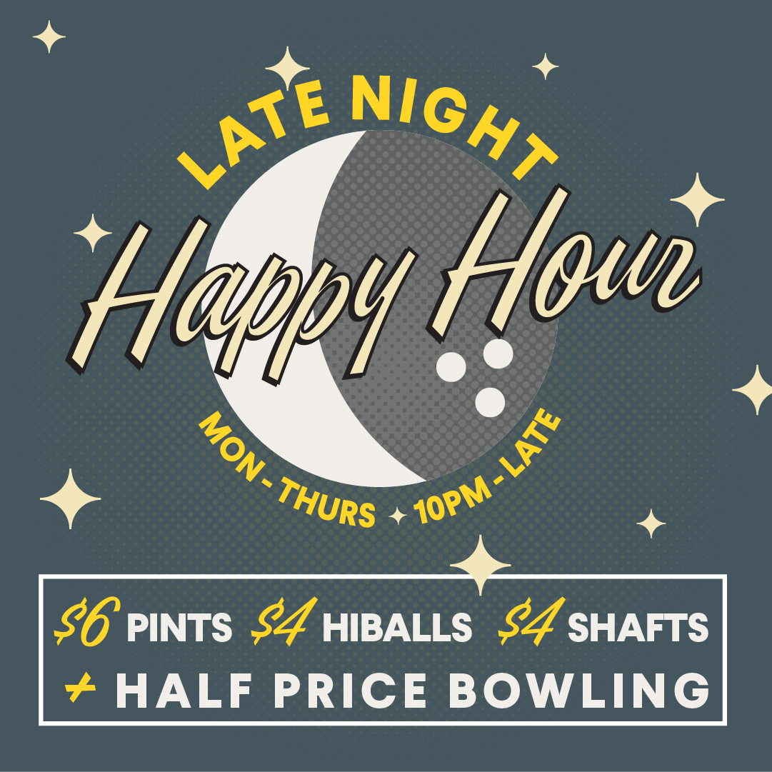 - ALL DAY HAPPY HOUR! $6 pints + $4 hiballs + $4 shafts, ½ off bowling